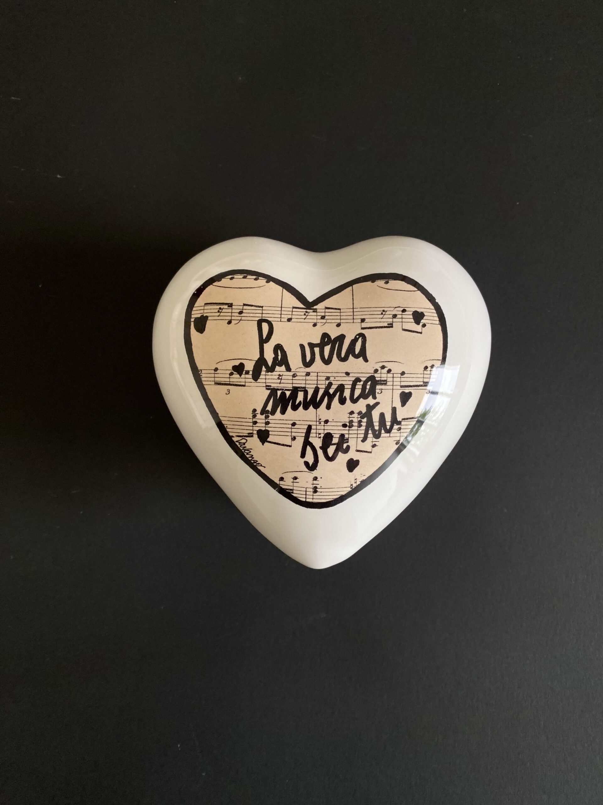 Cuore di ceramica bianco con grafica di Walter Davanzo