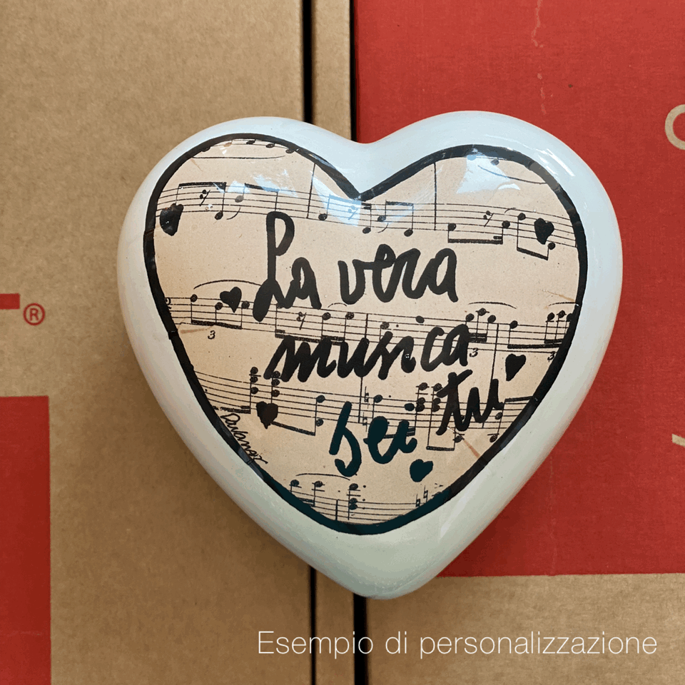 Il tuo messaggio personalizzato sul cuore: hai trovato il tuo cuore ma lo vorresti rendere più personale e unico? Possiamo aggiungere a mano una piccola dedica, una data, un nome. Il cuore sarà rimesso in cottura e il risultato sarà indelebile. Clicca qui per vedere quello che abbiamo già fatto.